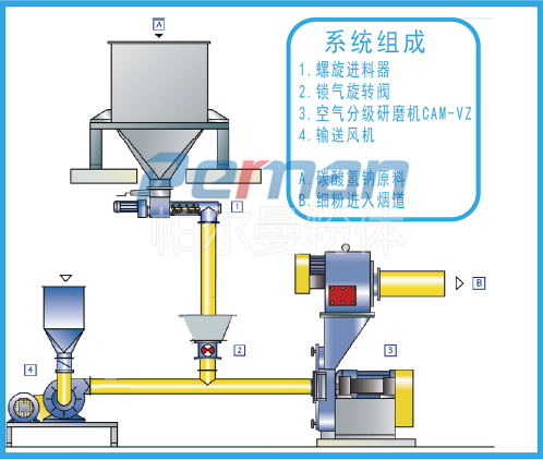 负压空气研磨系统的设备积垢问题经常是讨论的焦点。设备的清洗,特别是输送风机的清洗过于耗时。此外,在开机和关机过程中风机叶轮上的积垢还可能剥落,导致风机的振动及其运转状态的振荡。因此可考虑由负压流程改为正压流程。在新的工作模式下风机安装在分级磨之前,将工艺空气压入研磨系统。这种工作模式的优点是研磨后的碳酸氢钠不通过风机运输,完全避免了风机的积垢问题。此外风机的耗电也有所降低,使经营成本更低,但是对设备的密封性能提出了更高的考验,无论是设备的设计结构、加工精度及配合都有严格的要求,设备的造价成本也会更高。